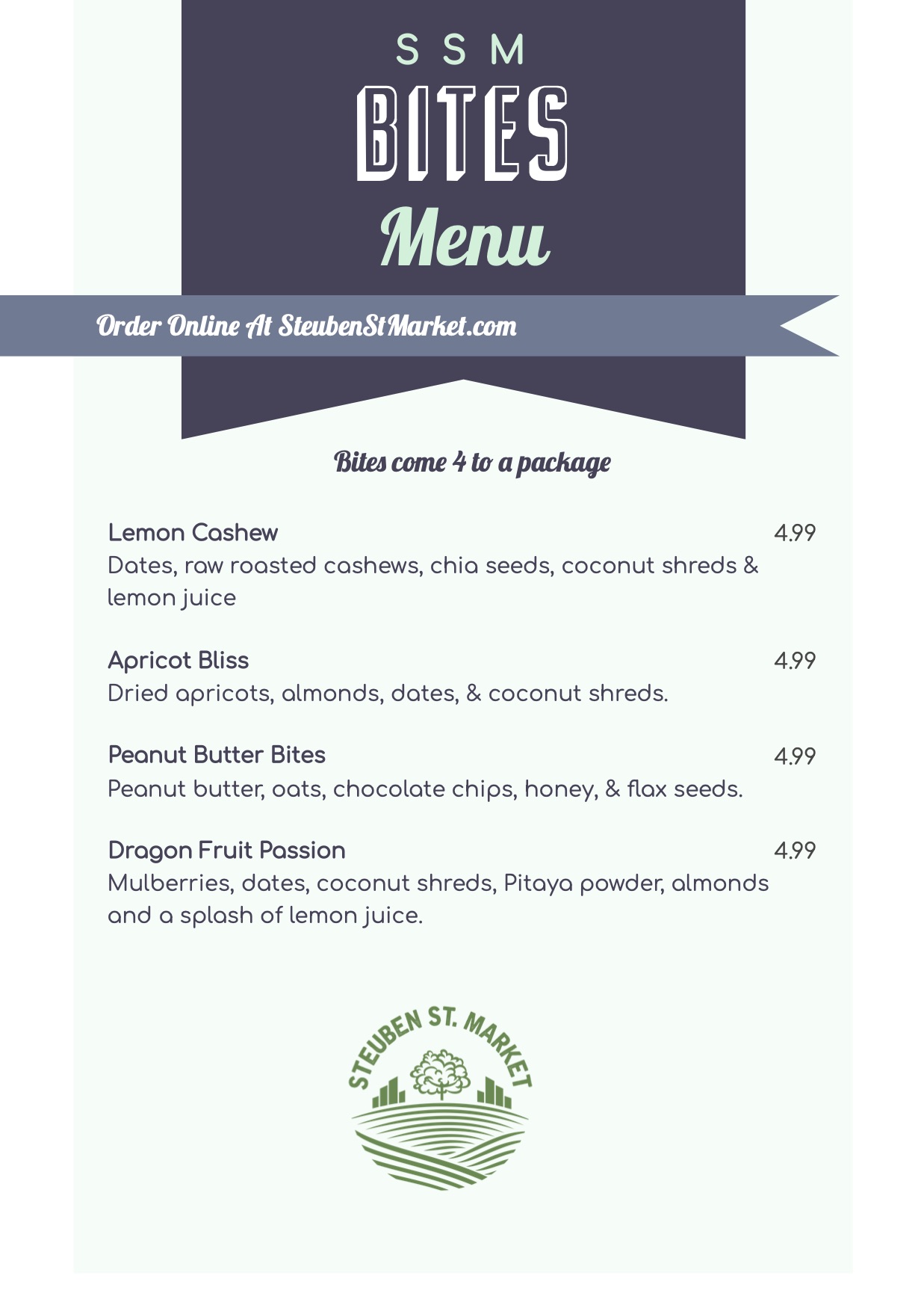 Our Bites are small batch house made with four bites per package and are the perfect on-the-go snack. Keep frozen, refrigerated or room temp for your desired texture.